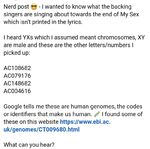 For me those voices saying "X" and "Y" and numbers are PRECISELY that: the chromosomes that makes us men or women, and the phone numbers we add to our agendas with mating purposes. Maybe it's just my theory, far from Jarvis original intentions, but.. doesn't make all the sense in the world? (And to be honest, I absolutely LOVE the way the songs ends with those voices)
