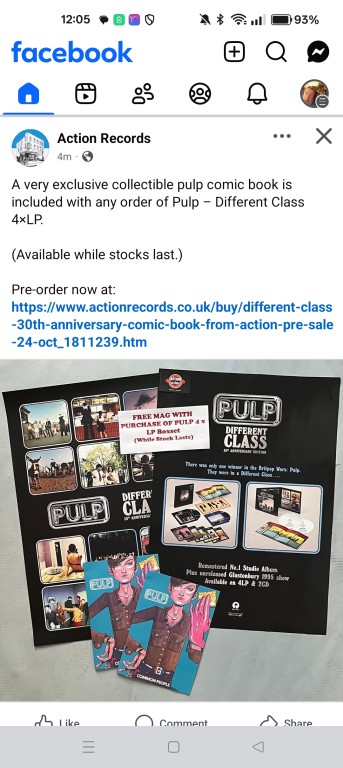 I caved, despite being skint, rang up a random record store in the Midlands that was listed by Pulp's social media as being a reseller who include the Common People comic with each order. As my local indie store didn't have any of the comics left. With postage came to £93, I think.